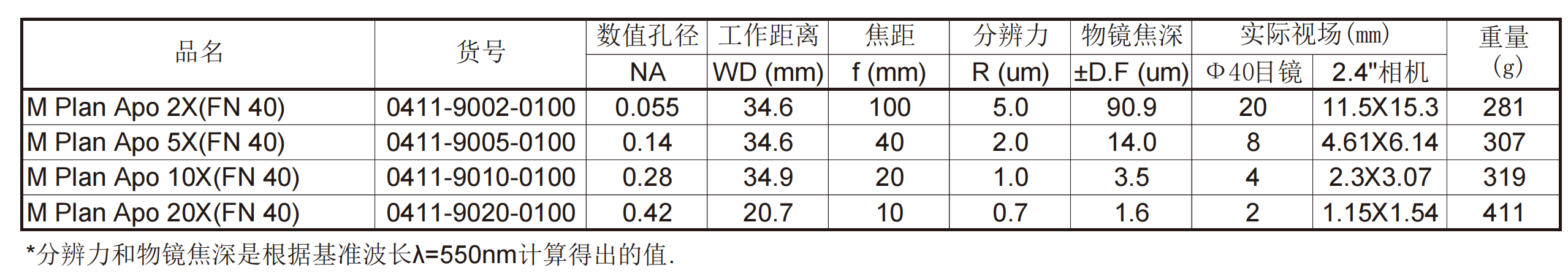明视场观察物镜<br>M Plan Apo